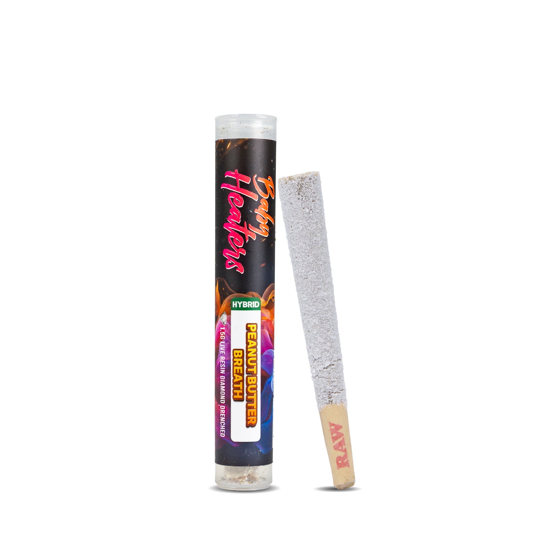 Peanut Butter Breath is as savory as it sounds, an indica-dominant hybrid that's all about flavor and feel. The aroma hits with creamy nuttiness and a touch of earthy funk, and the high follows with slow-building intensity. Your limbs will feel like they've clocked out, your thoughts stretch like taffy, and your mood floats just above the clouds. a fusion of Do-Si-Dos and Mendo Breath, this strain balances mental clarity with full-body chill, making it a go-to for decompressing without fully disconnecting. In our Baby Heaters 1.5g pre-roll, it gets the royal treatment: premium THCA flower, soaked in THCA Diamond Live Resin, then encrusted in diamonds for a slow, powerful, and flavorful smoke that lingers like late-night comfort food. This one's for end-of-day rituals, vibing with lo-fi beats, or zoning out in the best way. When the to-do list is toast and all you want is peace and peanut butter vibes, this roll delivers.